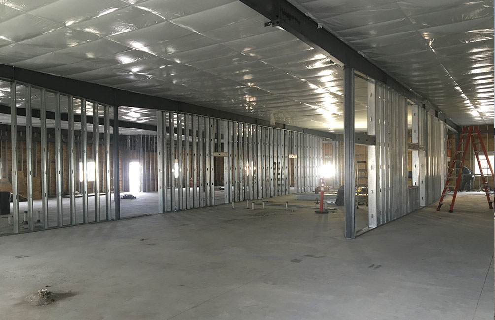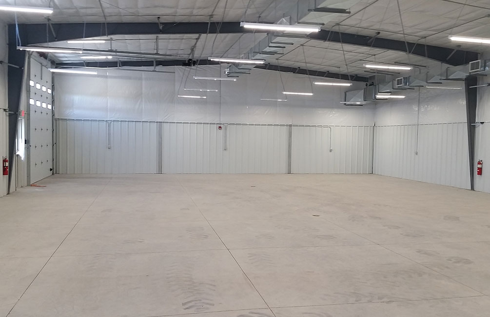 Complete interior remodel, supply and assemble a Behlen pre-engineered metal building, replace concrete, patch, and fill concrete floor.