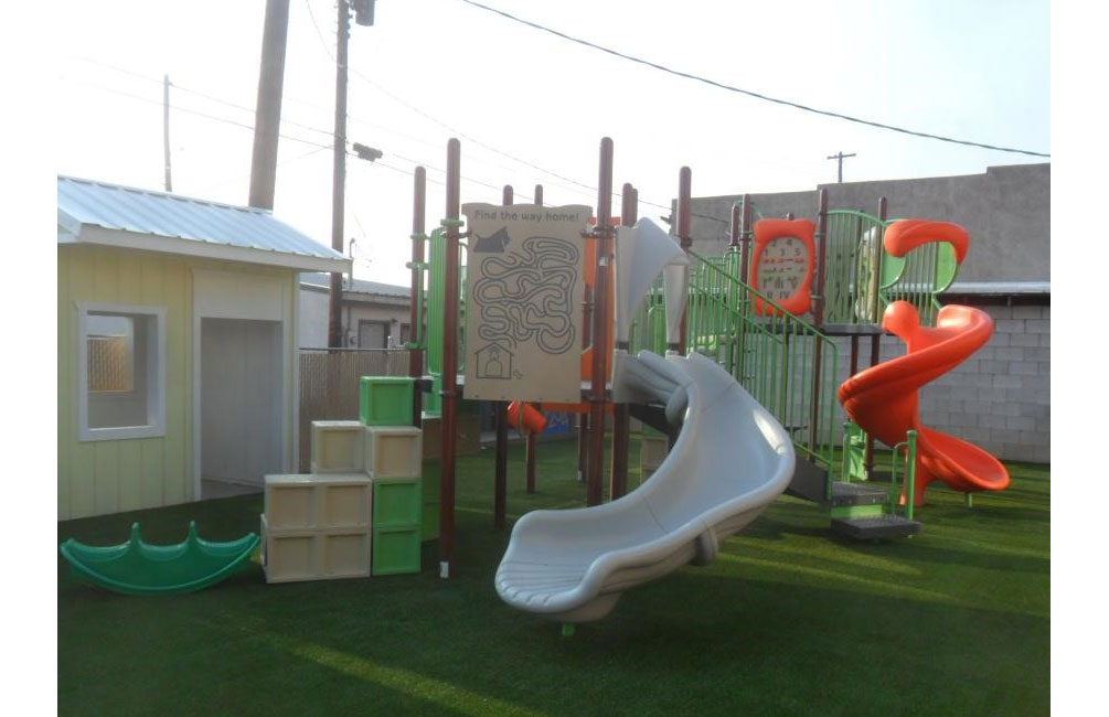 Replacement of asphalt and track, installing multi-use wood courts, turf surround, and a retractable batting cage.